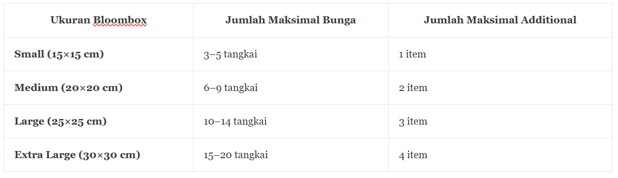 Pastikan jumlah bunga dan tambahan tidak melebihi batas kapasitas box agar hasil tetap estetik dan tidak padat. Jika melebihi, admin akan menyarankan untuk mengganti ke ukuran box yang lebih besar.